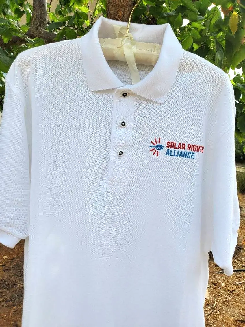 Proudly defend your solar rights with the Solar Rights Alliance Polo Shirt. Made of 65/35 poly/cotton, this polo shirt is soft and has wrinkle and shrink resistance, knit collar and cuffs, metal buttons, and side vents. Size small pictured here. Free shipping on all orders.